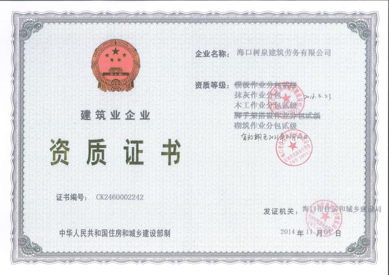 海口樹泉建筑勞務有限公司成立于2011年,公司位于海口,其前身是一家專業(yè)建筑施工隊,自2004年即開始在海南從事建筑勞務施工。自成立至今,公司已經擁有一支科學管理、質量過硬、能打硬仗,搶工期的專業(yè)隊伍。能獨立承擔大中型工業(yè)與民用建筑 、室內外裝修、各類機電設備安裝工程。代表工程有海口濱海華庭、三亞時代海岸T01/02/04/05棟高層、合肥東海花園二期、陵水富力灣B區(qū)高層、三亞金中海(酒店)、瓊海大印經典花園、海口環(huán)球海景大酒店(四星級酒店,在建中)、陵水珍珠大廈(五星酒店)、海口萬達廣場、美蘭機場二期。